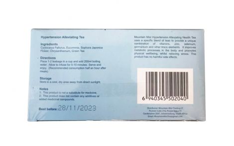 Mountain Mist Hypertension Alleviating Health Tea uses a specific blend of teas to provide a unique combination of vitamins, zinc selenium, germanium and other trace elements. It provides metabolic processes in the body and promotes physical wellbeing, whilst relieving stress. This product has no harmful side affects.